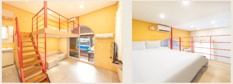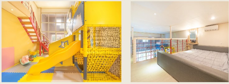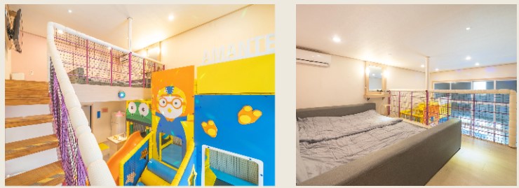 이번에 저희 가족이 묵은 로망 06 객실은 최대 8인까지 수용 가능한 스파와 키즈 정글짐이 있는 복층형 객실입니다. 아이들이 하루 종일 즐겁게 놀 수 있는 환경이 갖춰져 있어 가족 여행에 안성맞춤입니다.