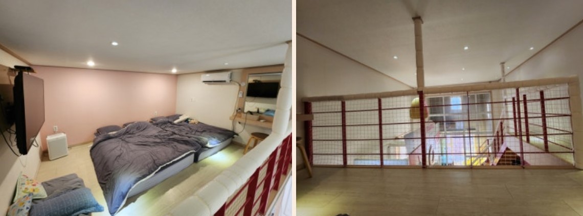 복층 구조로 된 2층에는 큰 침대 두 개가 마련되어 있어 편안하게 잘 수 있습니다. 1층에서 아이들이 뛰어노는 동안, 2층에서는 어른들이 쉴 수 있는 공간으로 활용하기에 좋습니다.